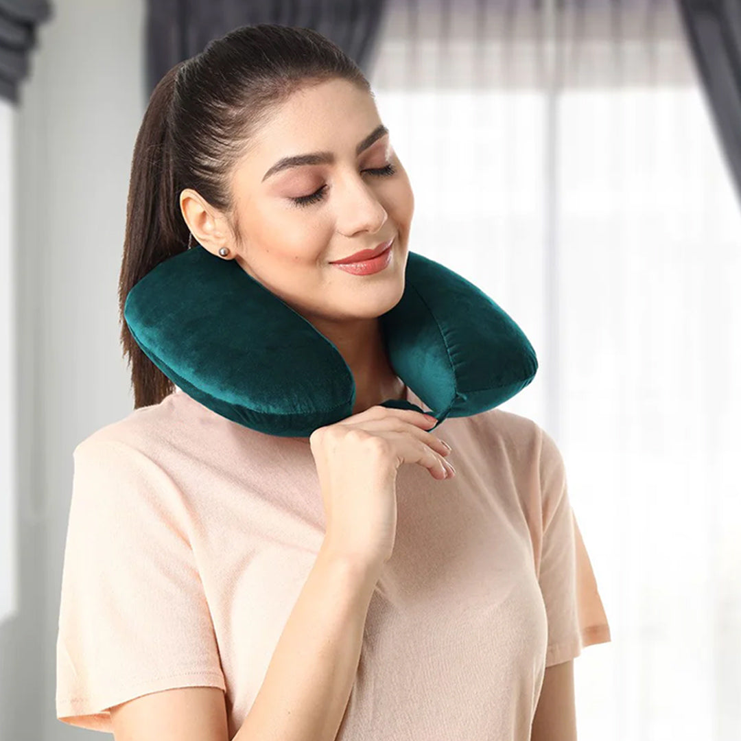 Velvet Neck Rest Pillow / Travel Pillow For Comfort & Support (Green)